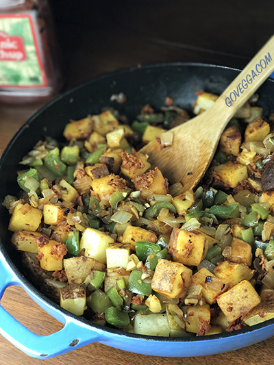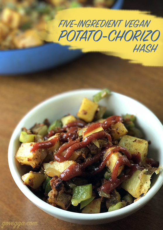 Spicy potato-chorizo hash! Two of the five ingredients are right there in the name, and the other three are not too tricky to guess: onion, garlic, and green bell pepper. This versatile recipe does involve a fair amount of chopping, but it’s relatively painless and makes a great lazy dinner or brunch side dish. For the chorizo, I use my go-to — the soy chorizo from Trader Joe’s — but any product with lots of flavor will work here. I keep seasonings to a minimum since the chorizo adds heat, and the onion and garlic provide quite a bit of flavor. If you’re not limited to five ingredients, go ahead and add some spices: paprika, Mexican oregano, or anything your heart desires.