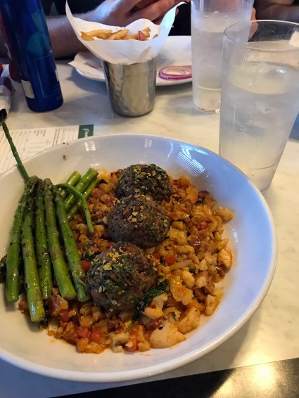 After much deliberation, I ordered the cauliflower mac and cheese, which features tempeh bacon, roasted tomatoes, asparagus, and a cheesy sauce served over cauliflower and zucchini… all topped with Beyond Meat meatballs. An unexpected combo, to be sure, and not only because there’s no pasta in this mac and cheese. I was dubious, but hopeful. Local vegan restaurant Great Sage has an outstanding mac and cheese that includes both pasta and big chunks of cauliflower, and I’ve often pondered ordering that dish sans pasta, but with added cauliflower.