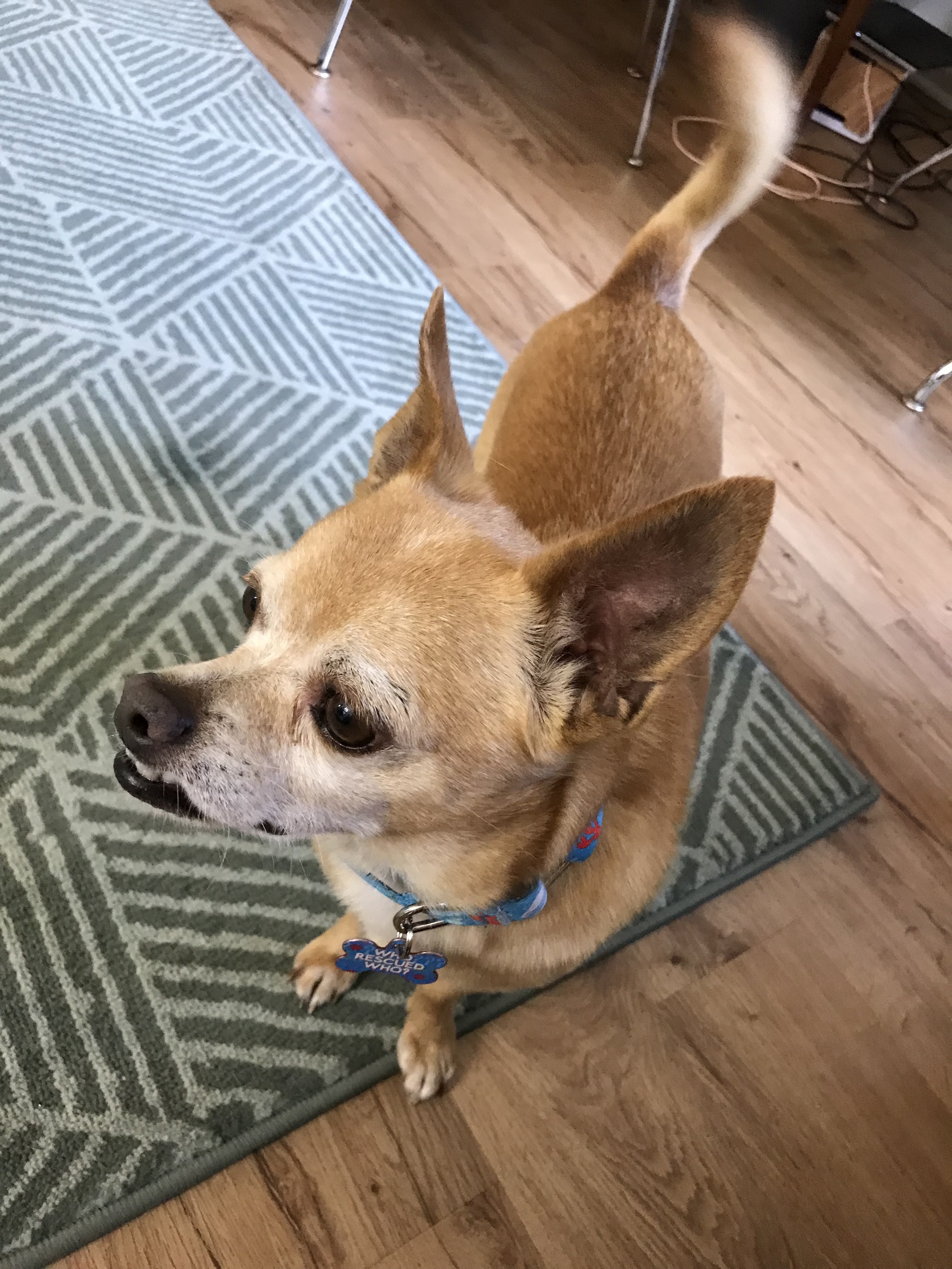 Sara and Ron have a pack of four small and wonderful puppers, including their newest addition: Scooter! Look at this little doofus.