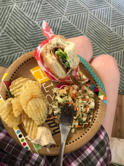 Post-bread baking, we headed across the street to celebrate our friend Ron’s birthday! Sara had gotten a platter of vegan sandwiches from Firehouse Deli, a local deli that bizarrely offers a TON of vegan options, so I feasted on an Italian cold cut sandwich. She’d also picked up a really tasty sesame slaw, along with chips and dip — basically, the perfect summer party plate. Firehouse also makes vegan cupcakes; I chose lemon while Steven had birthday cake (!). I really appreciate that we can support a small local business when we need vegan catering rather than a massive company like Whole Foods. Firehouse is a funny little place located right along a busy main road, but you can spot it by the electronic marquee that flashes the word “VEGAN” along with “GYRO” and “REUBEN.” Ha.