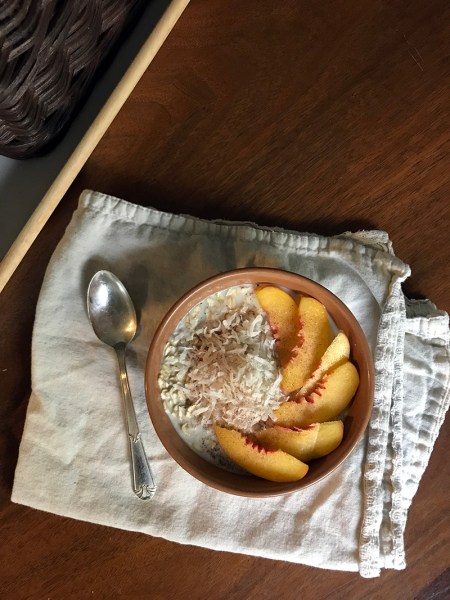 So, what did I get up to on this final day of August — and the first day of a long weekend? Well, I started off with my new favorite breakfast. I often rely on oatmeal or overnight oats, but earlier this week, I made something different before heading to work. I mixed up oats, oat milk, a little agave nectar, and some coconut flakes, and ate it all as-is. No heating; no overnight soaking. “Wow,” I thought. “This is good! Lightly soaked oats with fun add-ins, how novel!” And then I realized… oh yeah. I’m eating muesli. Haaaa. I returned to this newly discovered — yet well-known — brekkie this morning, right before I headed off to a volunteer assignment with two hospice patients. I used oats, oat milk, peach slices, coconut flakes, and a little sprinkle of cinnamon sugar. Perfection!