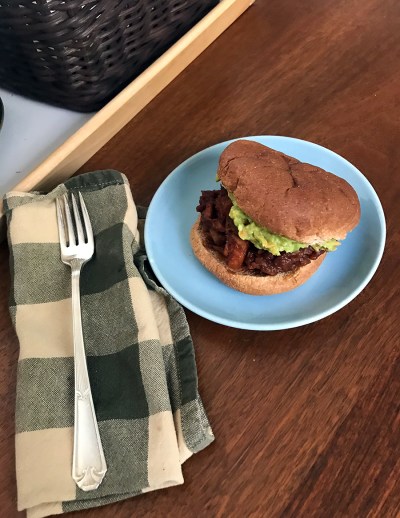 When I came home from the pool, Steven was just wrapping up a very tasty dinner: BBQ heart of palm sandwiches, served with a carrot-y, lime-y guacamole! Guac twice in one day; how indulgent.