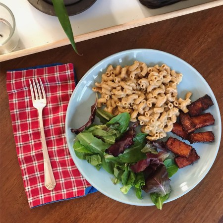 And about the mac and cheese. Steven used this much-heralded VegWeb recipe, reducing the oil (!!!) and adding some shredded Violife parm for good measure. It was nice and creamy and a good reminder that sometimes old-school vegan recipes are worth keeping around, even when newfangled fancy products seem so much flashier.